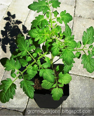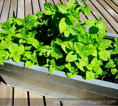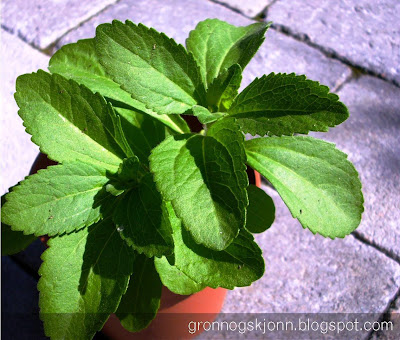 Her kan dere se litt av utviklingen i urtehagen. Mynten fyller villig sin plass i sinkpotten og steviaplanten har fått kraftige blader. Begge disse urtene høstes med jevne mellomrom slik at jeg kan dra nytte av dem også til vinteren. Her er også et bilde av en av tomatplantene. Alle er nå i blomst og har begynt å få fruker.