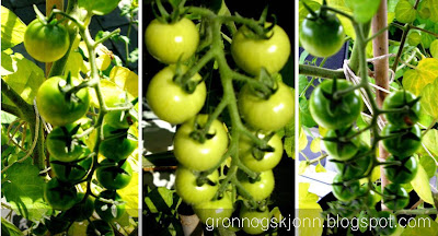 Jeg sådde to typer tomatplanter i våres, det ene var Vildtomat og det andre var Supersweet. Siden begge typene gir mange, mange små tomater har jeg mistet litt oversikten over hva som er hva, etter mang en ompotting og flytting hit og dit. Uansett så har jeg klart å få frem en mengde grønne mini-tomater.