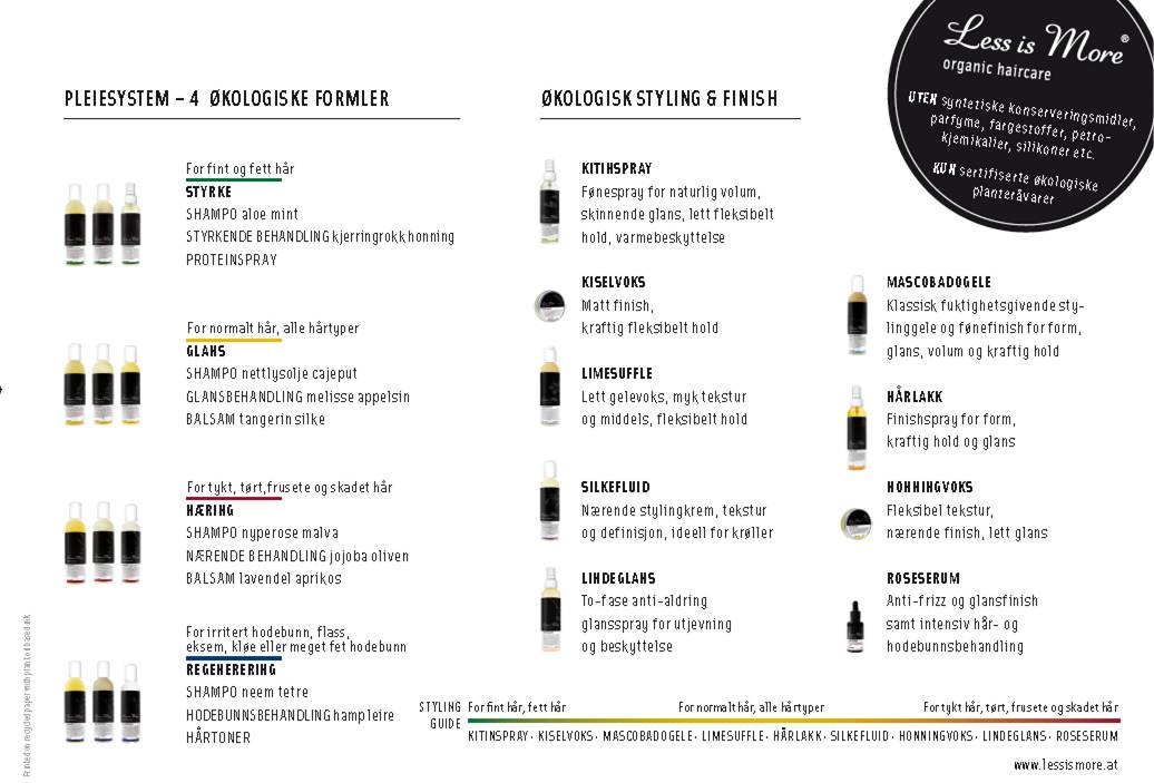 Vi har fått spørsmål fra flere som lurer på hvilke produkter fra Less is More som passer sitt hår best. Det være seg alt fra pleieprodukter til stylingprodukter. Med denne hårguiden blir produktvalget mye enklere. Til venstre i bildet ser du de fire pleiesystemene med shampo, balsam/kur og leave-in produkt. Disse jobber med forskjellige utfordringer håret ditt måtte ha når det gjelder vask og pleie.